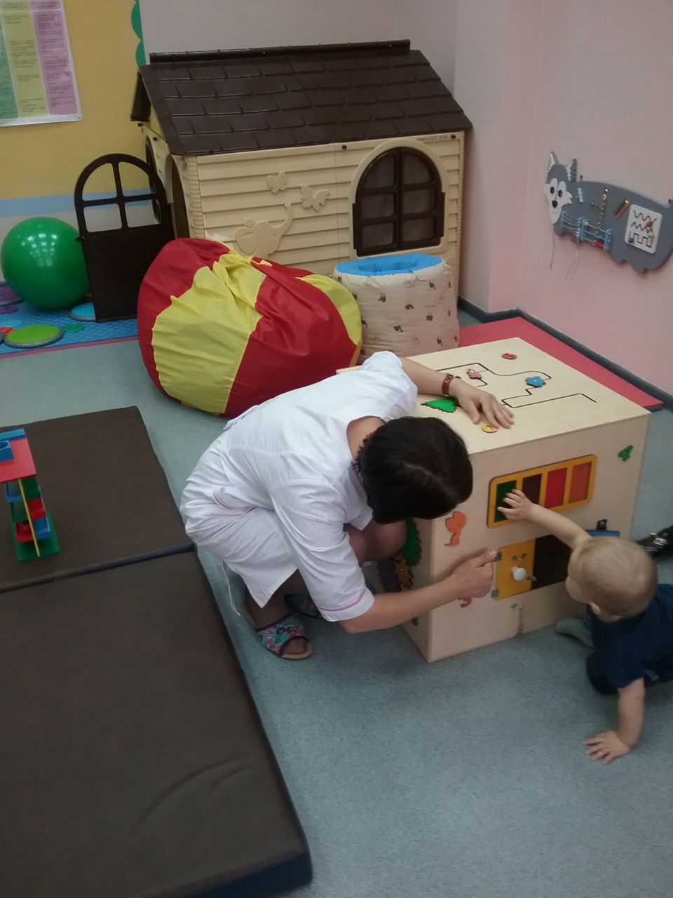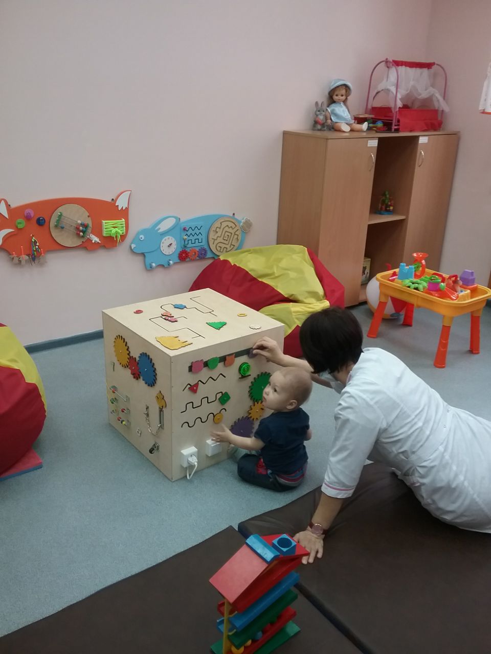 Если малыш способен сам передвигаться, то даем ему такую возможность – освоиться в пространстве и подключаем все наши возможности – лекотеку и оборудование СРП.