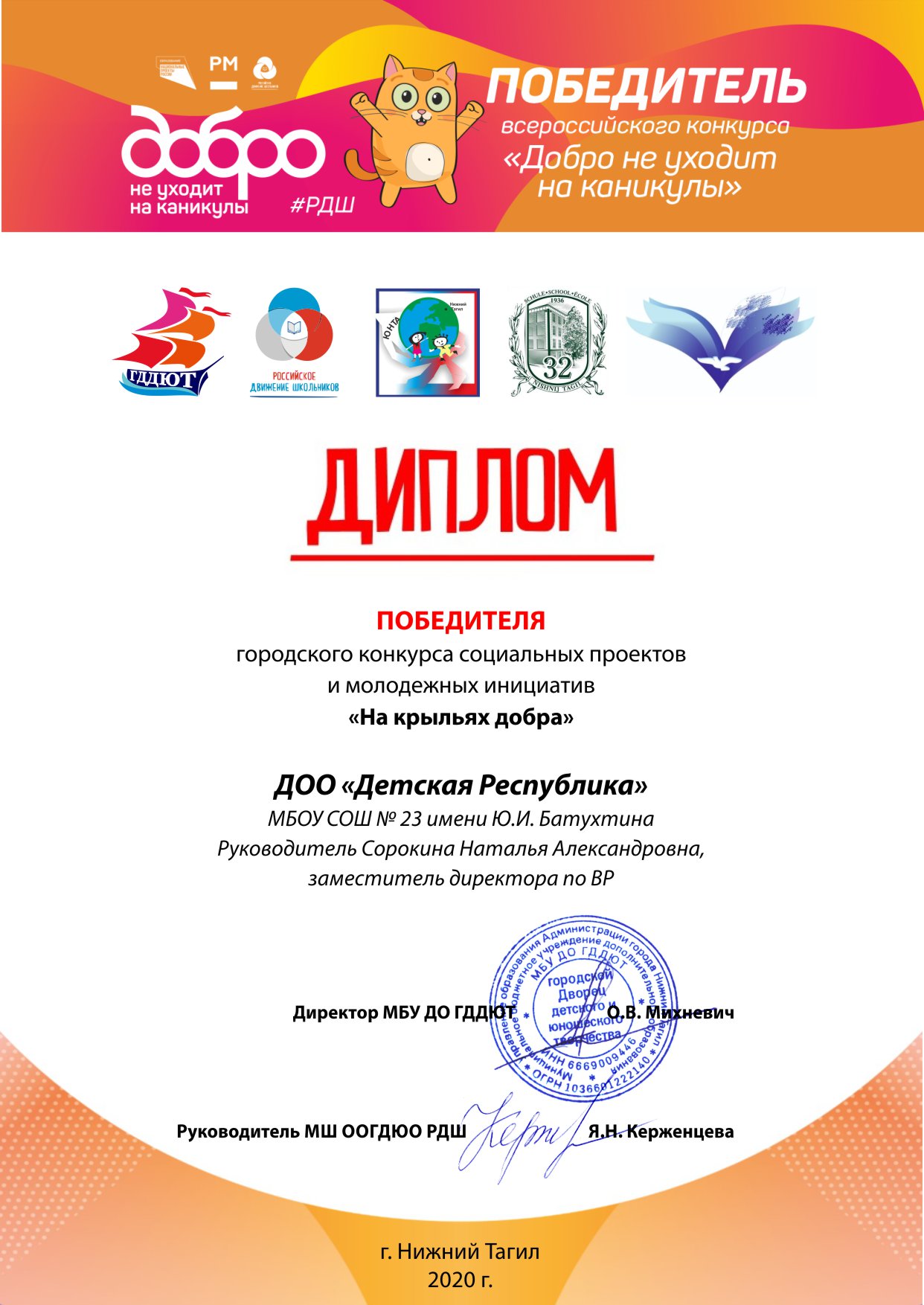 Диплом победителя городского конкурса социальных и молодежных инициатив "На крыльях добра"