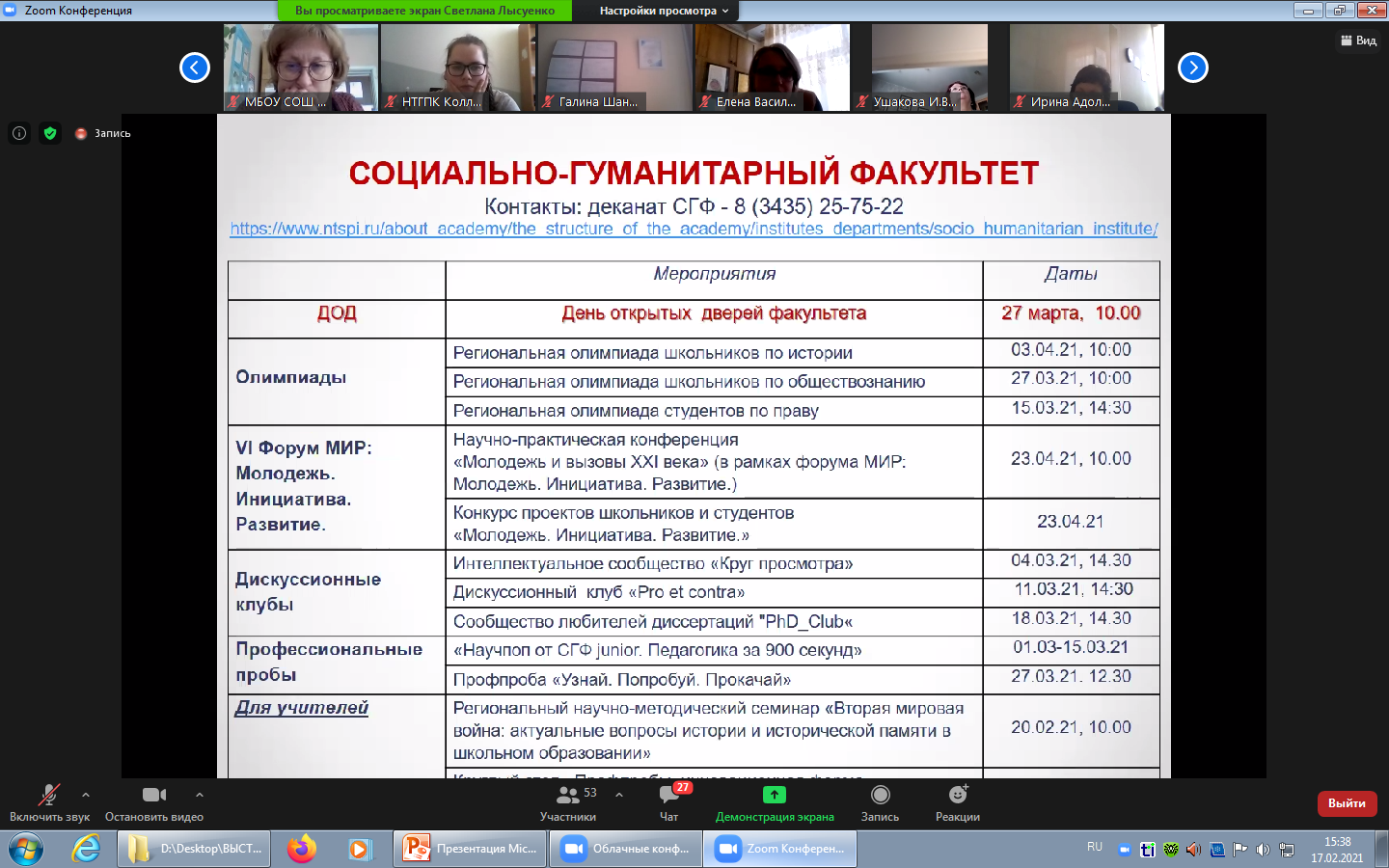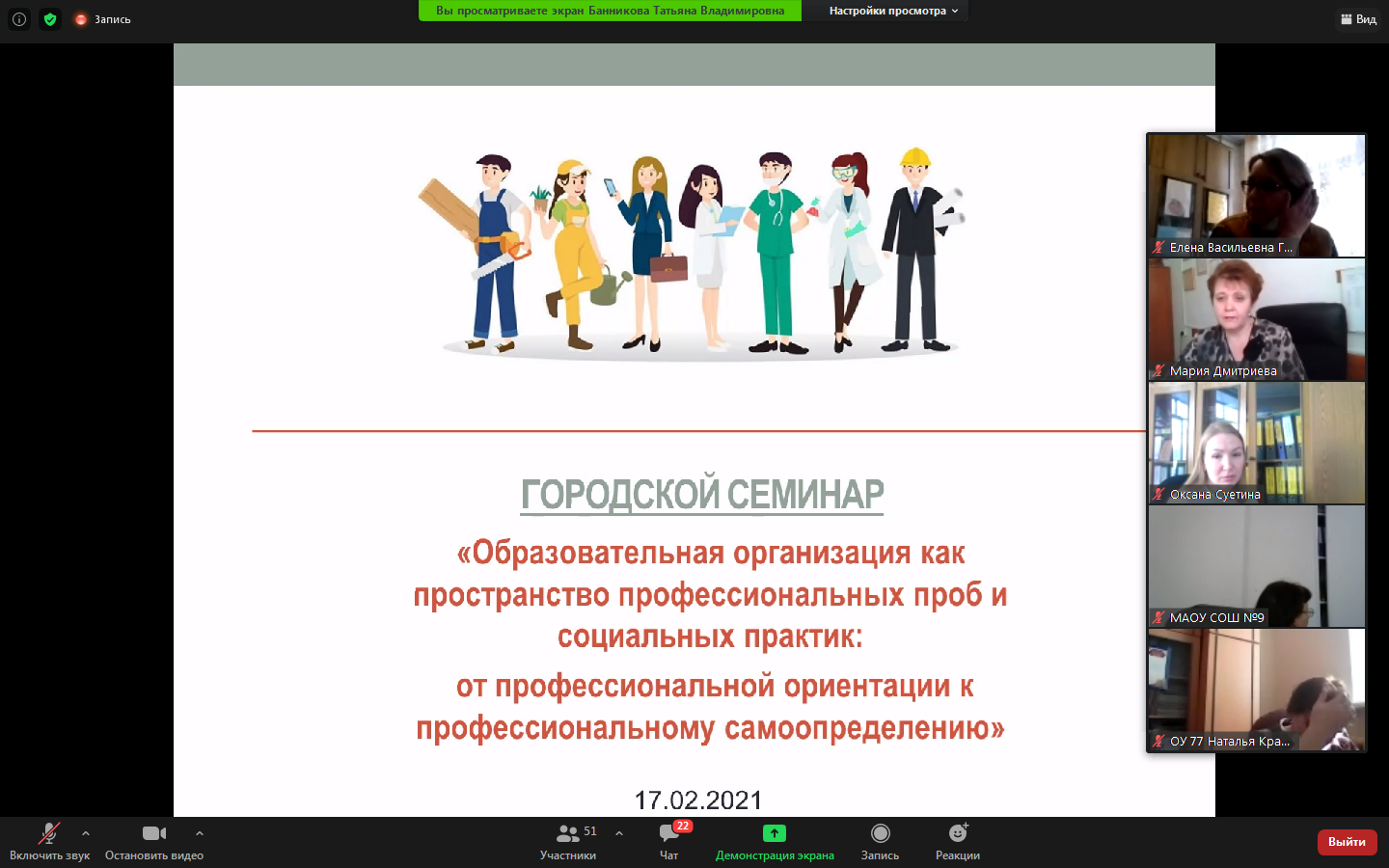 17 февраля 2021 года в гимназии состоялся городской семинар по теме «Школа как пространство профессиональных проб и социальных практик: от профессиональной ориентации к профессиональному самоопределению». Целью встречи стало представление опыта работы гимназии по организации целостной системы психолого-педагогического сопровождения профессионального самоопределения обучающихся в рамках деятельности региональной инновационной площадки, статус которой гимназия получила в сентябре 2020 года. В работе семинара приняли участие около 60 заместителей директоров общеобразовательных организаций г. Нижний Тагил, а также представители социальных партнеров Гимназии.